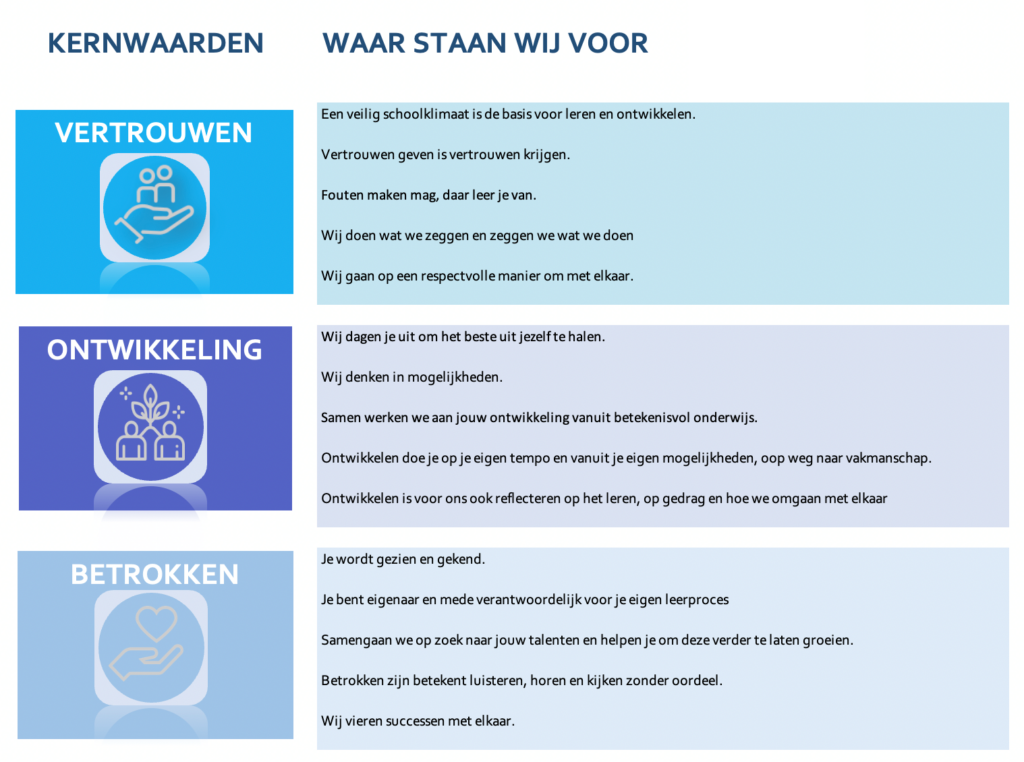 Vanuit onze missie en visie hebben wij een aantal kernwaarden vastgelegd: vertrouwen, ontwikkeling en betrokken. Onze kernwaarden verklaren het waarom van ons handelen. Waarom doen we de dingen zoals we ze doen? Het is van belang dat iedereen die op onze school werkt, zich herkent in deze kernwaarden. Zo zijn ze verankerd in de basis van ons handelen.